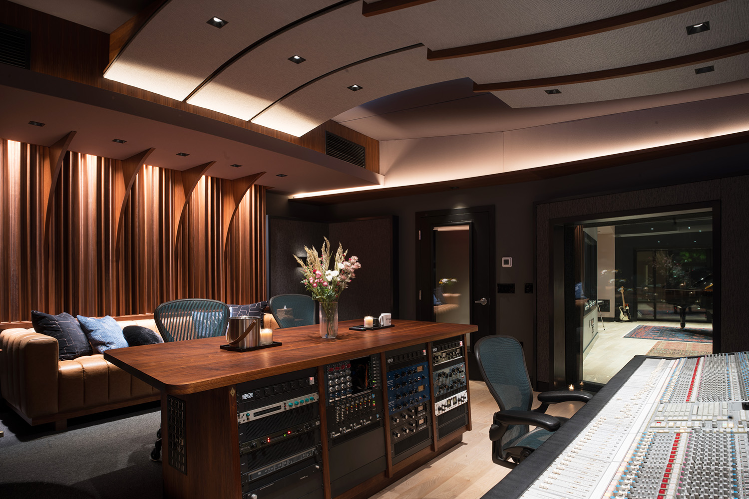 The 460 ft² Control Room features beautifully designed curved clouds and soffits conveying a sense of movement while also creating a controlled acoustic environment ideal for critical listening. The centerpiece of the studios’ recording and mixing operations is a vintage SSL 4056G console with main monitoring provided by a custom-set of handmade, Augspurger-style monitors.