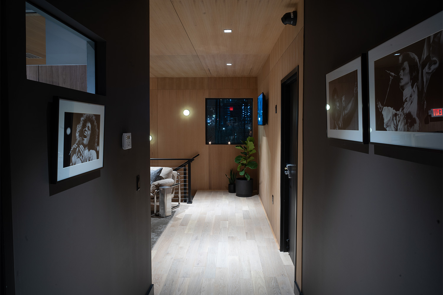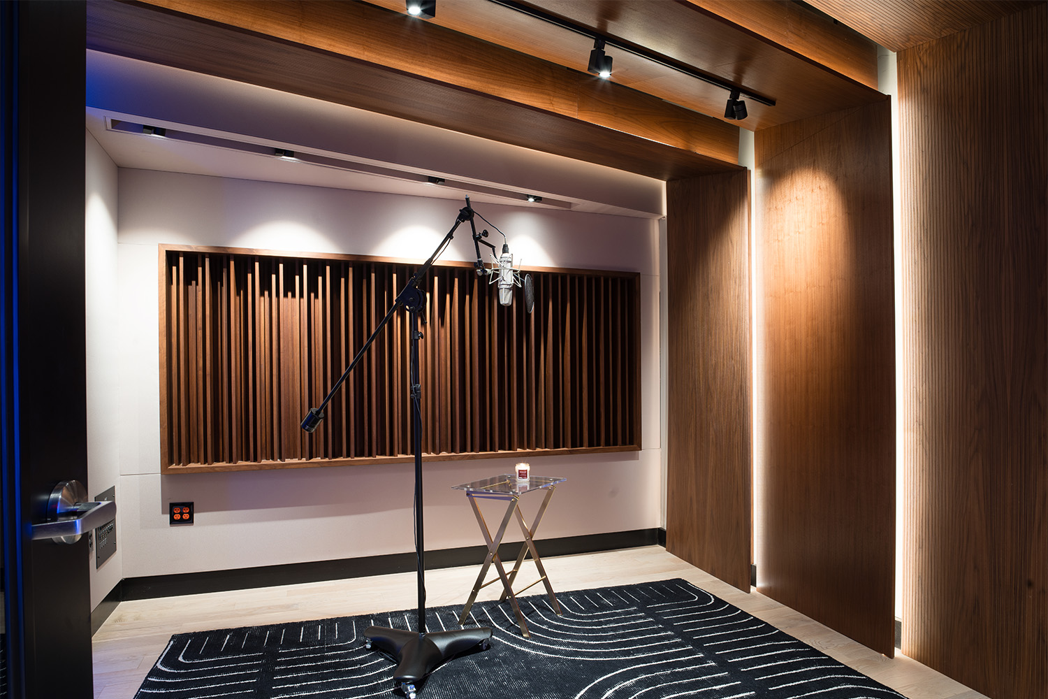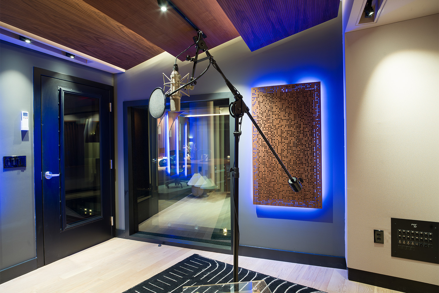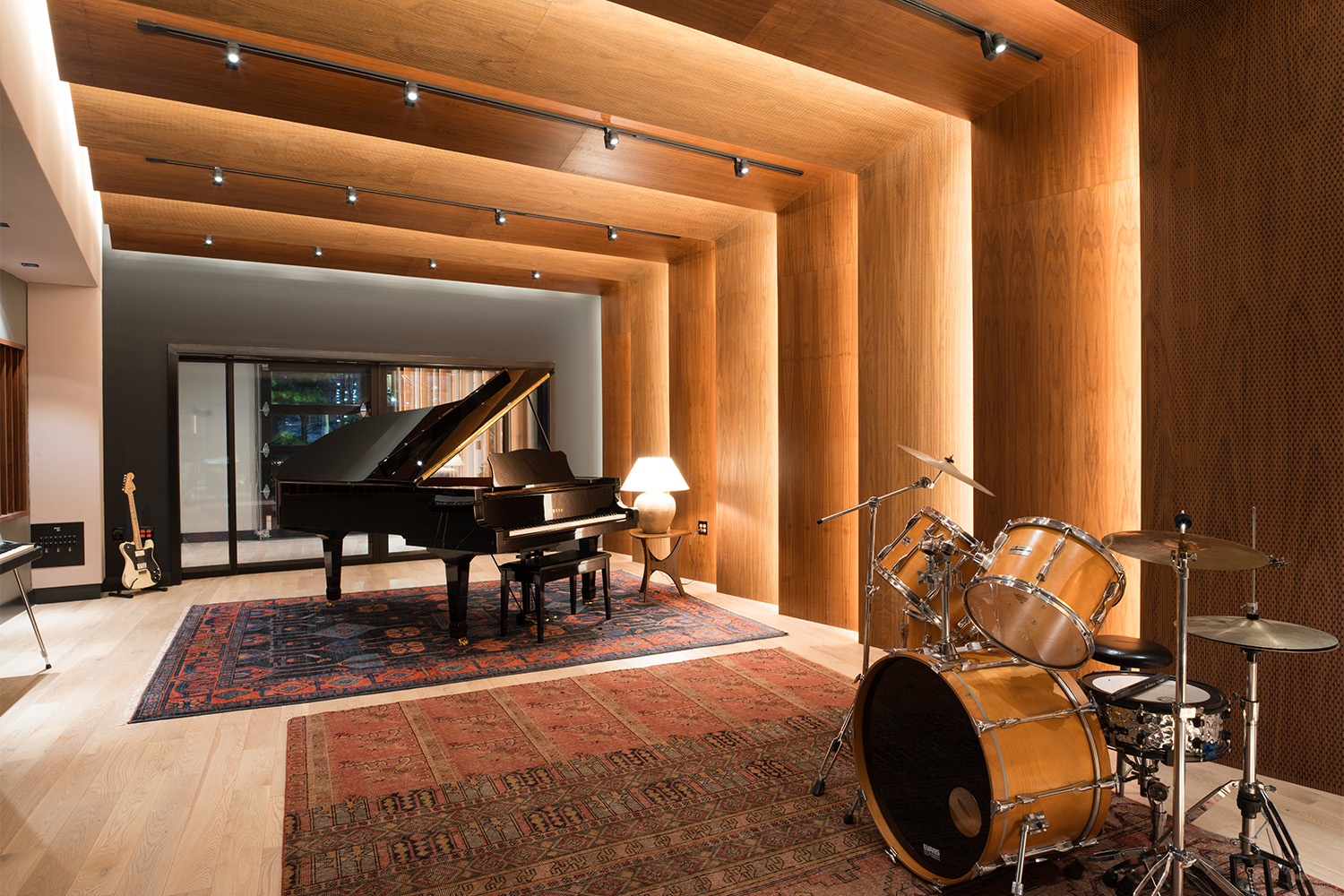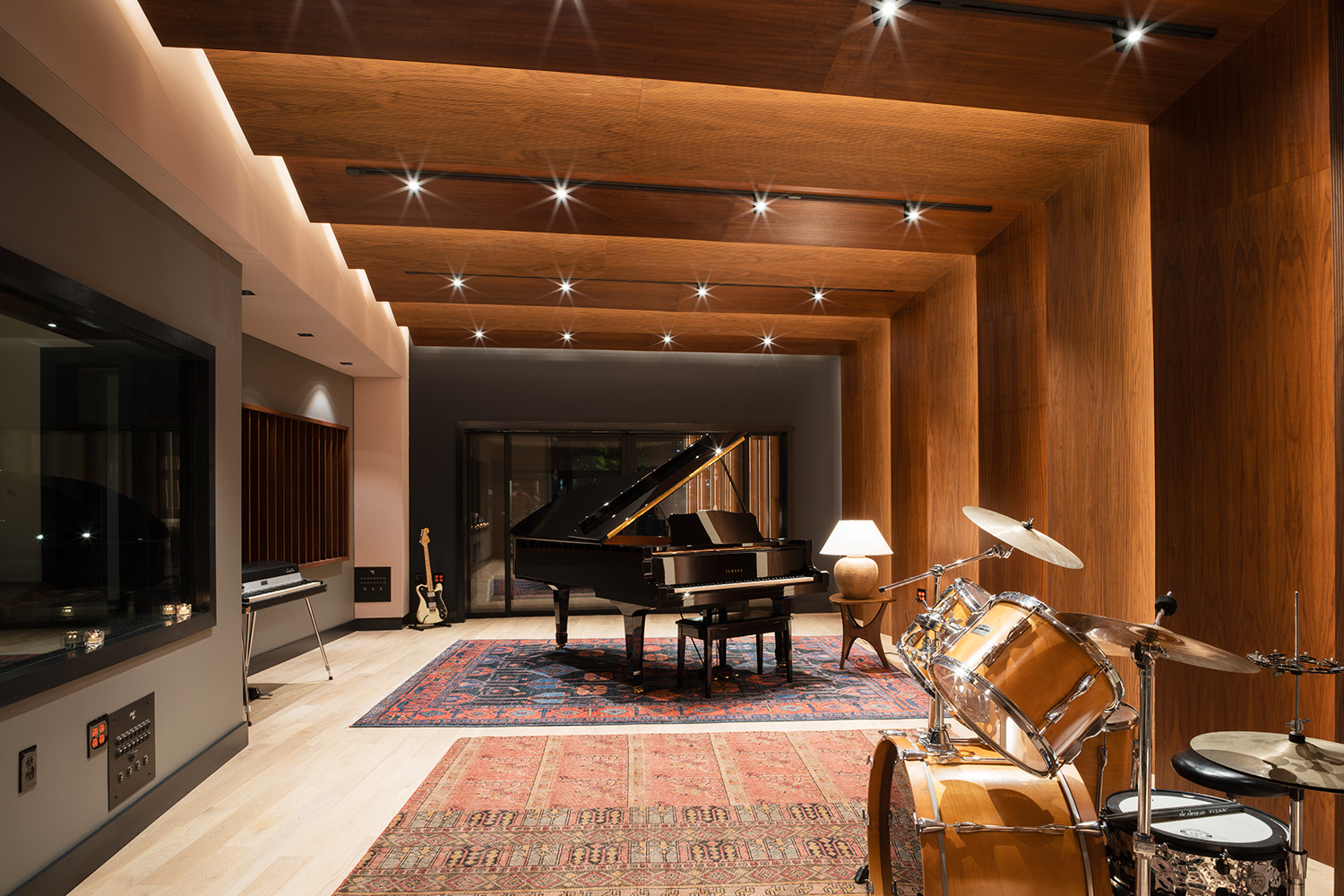 The 525 ft² Live Room is a versatile, full band-friendly performance space capable of hosting a wide variety of projects across all musical genres. The Live Room has been designed with purposeful sightlines through the Control Room to the 150 ft² Iso Booth as well as to the private lounge. In addition to housing the studios’ 2003 Yamaha C7 Grand Piano, the Live Room also offers artists access to a private balcony space via 18-foot sliding glass acoustic doors. A combination of solid and perforated wood treatments provide acoustic control at target frequencies while not compromising the room’s lively atmosphere or aesthetic.