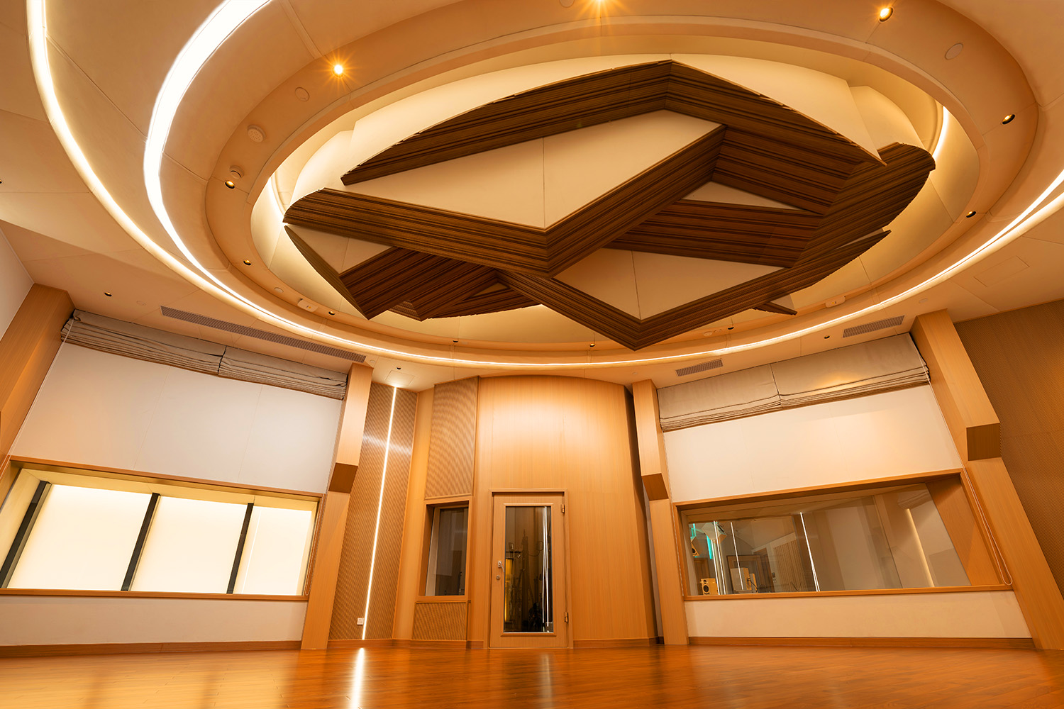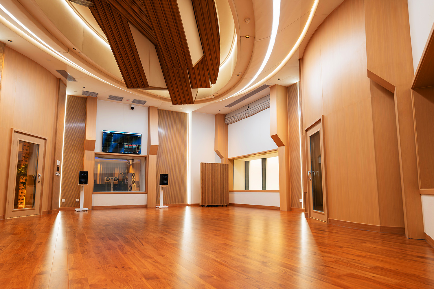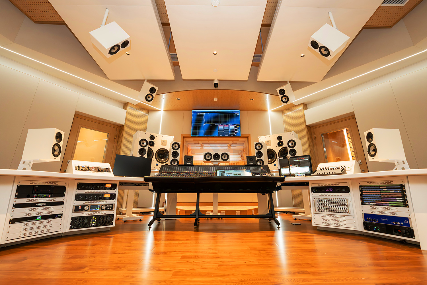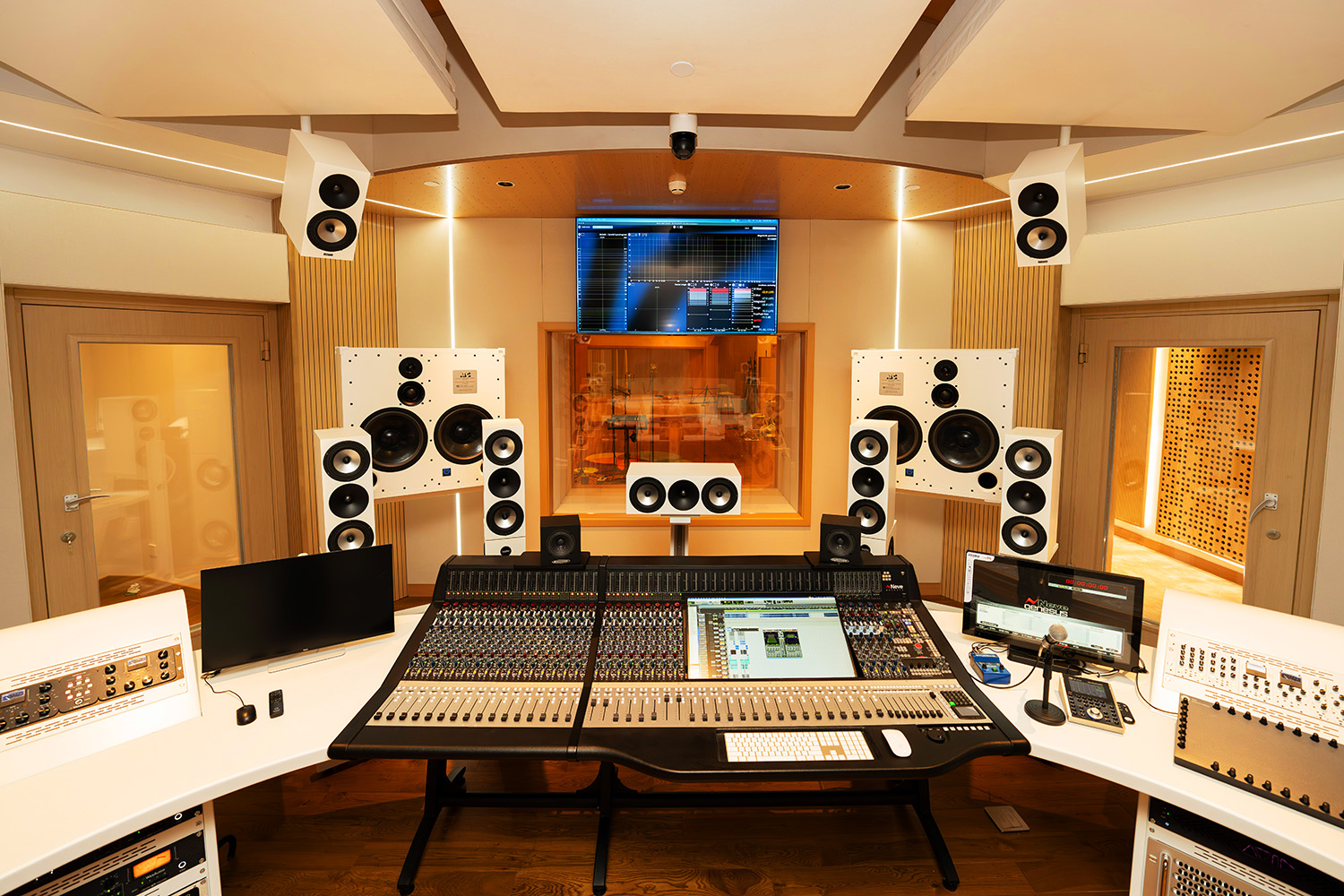 Control Room A (65m²) is oriented for Music Production and features an AMS Neve Genesys Black G4 Console, ATC SCM300ASL Pro and Amphion Dolby Atmos Monitoring for 9.1.6. production. It features a clean, minimalist design with a cream coloring and embedded LED lighting with a warm wooden floor. It also features a raised circular platform and comfortable couch for artists to sit during mixing.