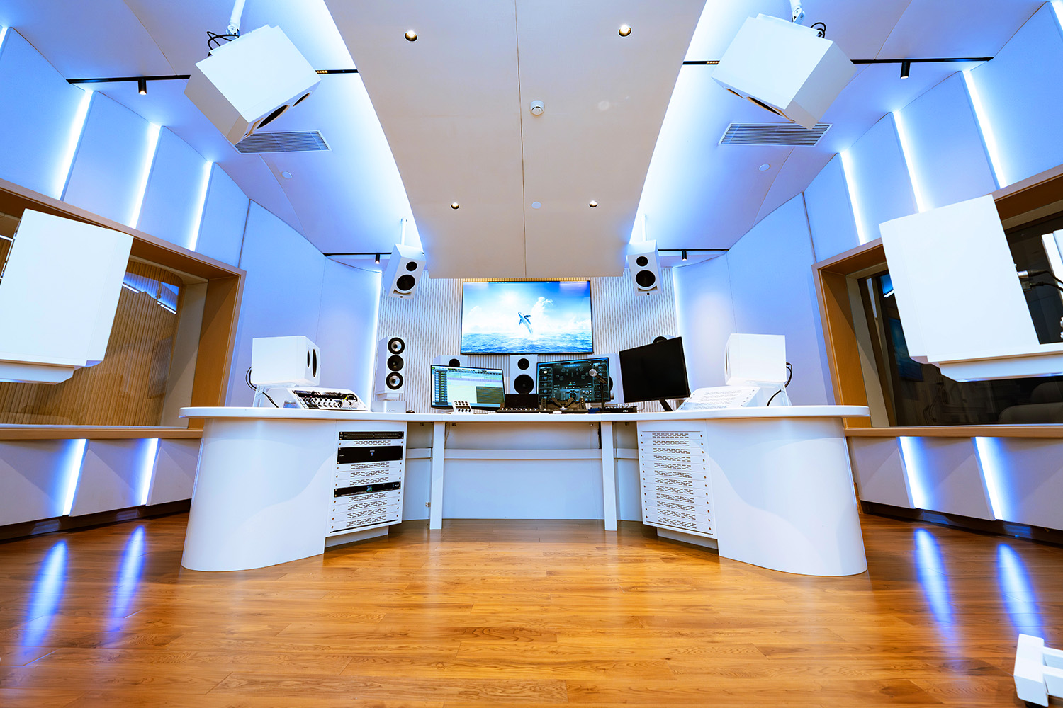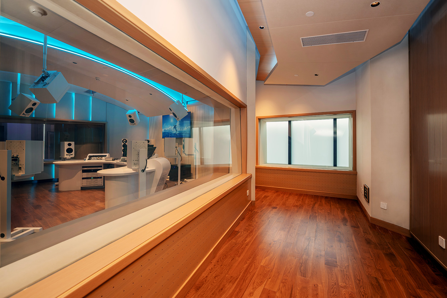 Control Room B (30m²) is designated for ADR Vocal Recording with a smaller performance space located behind it. It includes a Kali Dolby Atmos Monitor System for 7.1.4. Both Control Rooms A and B have ample sightlines to the live rooms and iso booths for visual connection between the engineers and talent. Control B features a clean white design, with a futuristic aesthetic.