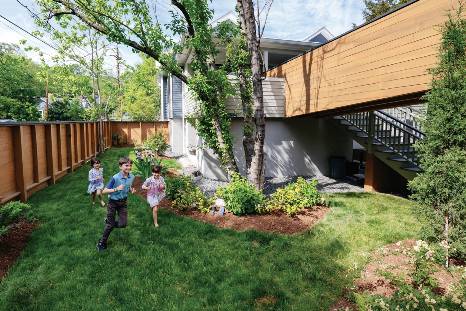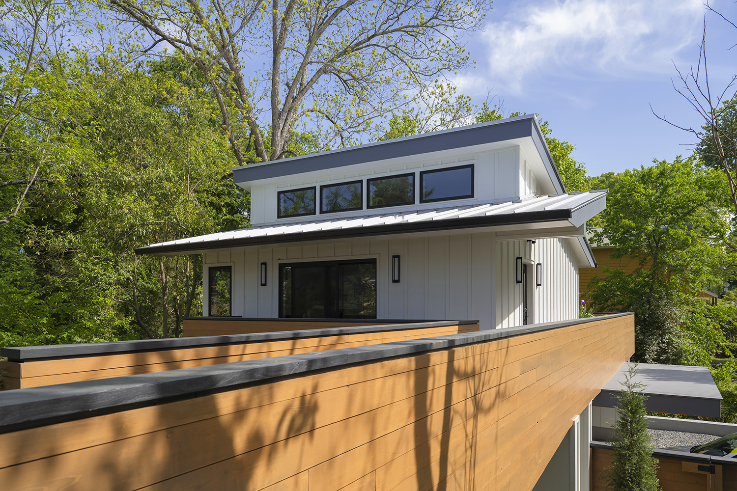 Unique to the renovation is a 35 foot pedestrian bridge which connects the renovation to a new more modern two story structure housing a garage / shop as well as Beth’s painting studio. All of this took place due to the unique sloping nature of the urban site down to a small stream.