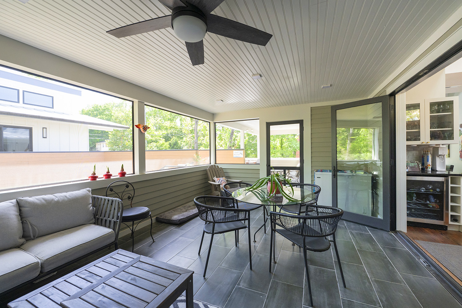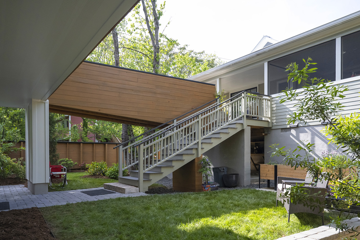 The original home maintains its classic design aesthetic, while the sides and rear have a modern look befitting the identity of its owners. It was essentially re-configured to now accommodate a new master bedroom guest bedroom and private office for John’s work. The building was then extended in a similar respectfully historical style to house a new living room, dining room, large kitchen for Beth’s cooking passion, screened in porch and outdoor deck.