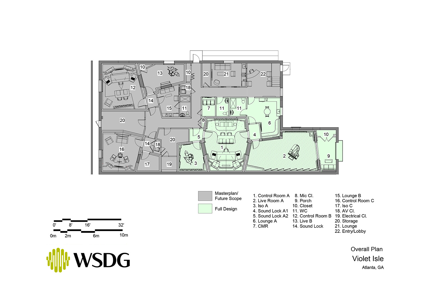 The WSDG team was tasked with master planning for the future 3 room studio facility and a full studio design for the Studio A suite. This includes control room, live room, Iso Booth design, acoustic isolation and optimization, A/V infrastructure design, and collaboration with interior design.