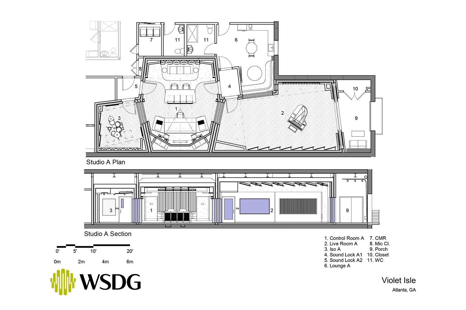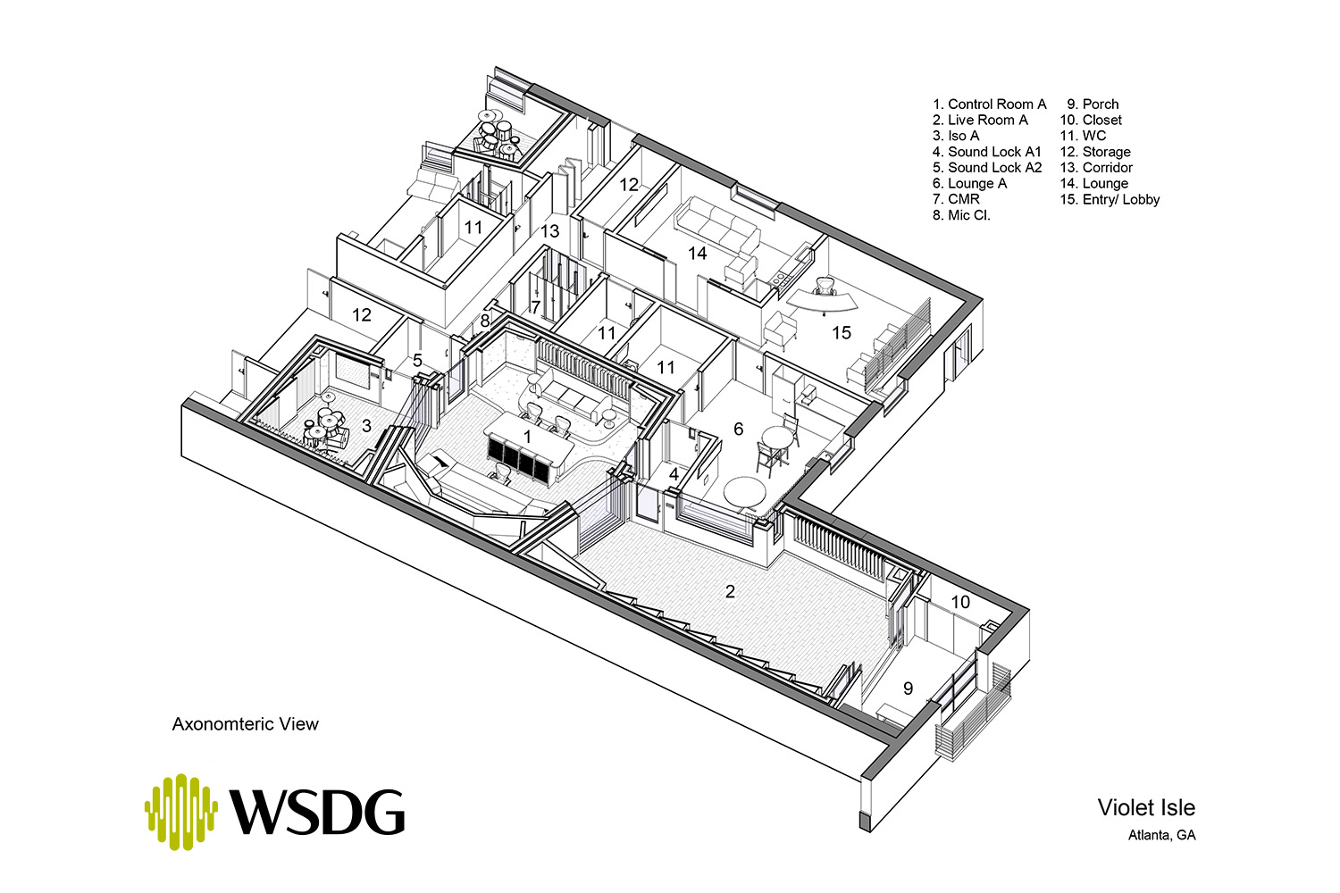 Built in a former t-shirt printing press centrally located in midtown Atlanta, Violet Isle is a private gated recording studio featuring sweeping views of the growing Atlanta skyline, a unique open floor plan style studio layout, and several connecting glass views between the rooms and outside. Violet Isle was designed with careful attention to ergonomics and work flow- keeping service, hospitality, and privacy at the forefront with multiple support spaces around one premier acoustic space. These supporting spaces include two private lounges and an in suite full restroom and kitchenette. The studio suite features a thoughtful selection of vintage and modern outboard gear and microphones, custom main Augspurger-style monitors, a 2003 Yamaha C7 grand, a vintage SSL 4056G console, beautifully designed curved clouds and soffits conveying a sense of movement, and a large live room and separate isolation room capable of hosting a wide variety of projects across all genres.